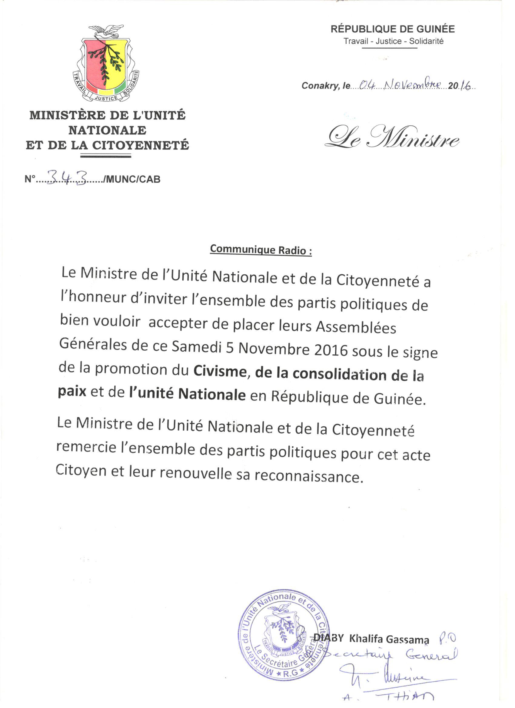 Les communiqués du Ministère de l’Unité nationale et de la Citoyenneté. Non classé By Rédaction On Nov 7, 2016 1 Share Facebook Comments Box Nombre de vues de l'article : 11