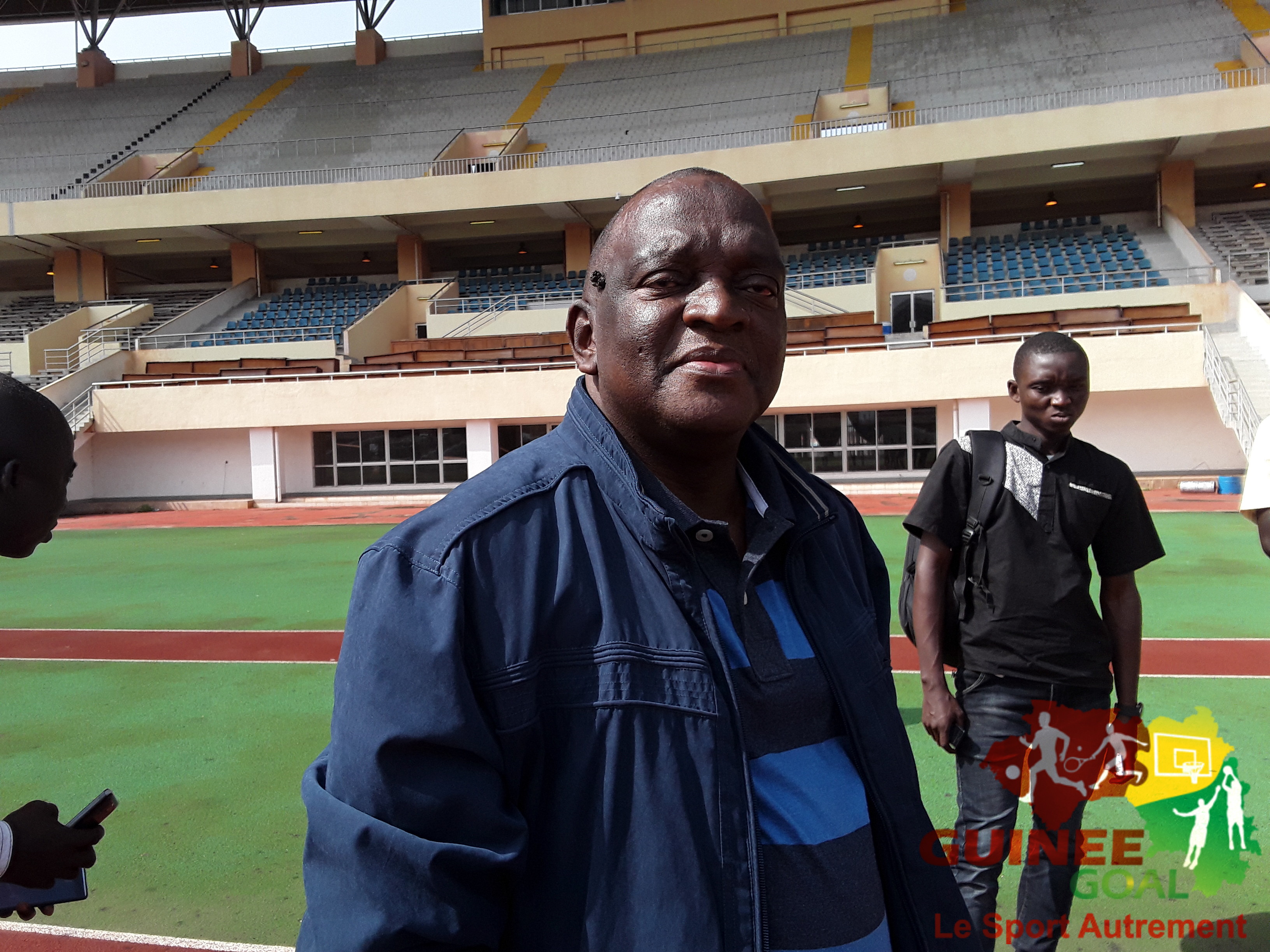 《 Je tiens d’abord à vous rappeler que le Stade de Nongo est un don de la république de Chine. En plus laissez mois vous dire que les travaux avancent à grand pas. D’ailleurs comme vous le constatez à l’instant on est entrain d’arroser la pelouse. Ce qui est fait tous les jours deux fois c’est à dire matin et soir. Notre technicien en la matière le fait très bien. Ensuite nous avons l’intention de refaire toutes les toilettes car nous avons près de 150 toilettes à reprendre. Et la société qui doit faire le boulot, s’active elle aussi. Par rapport à cela, nous comptons aller très vite pour la satisfaction générale tous les amoureux du cuir rond. Puisque l’ancien modèle de toilette n’était à usage publique. A préciser que ces travaux sont réalisés par les sociétés guinéennes sous la houlette financière de MR Mamadou Antonio Souaré.》